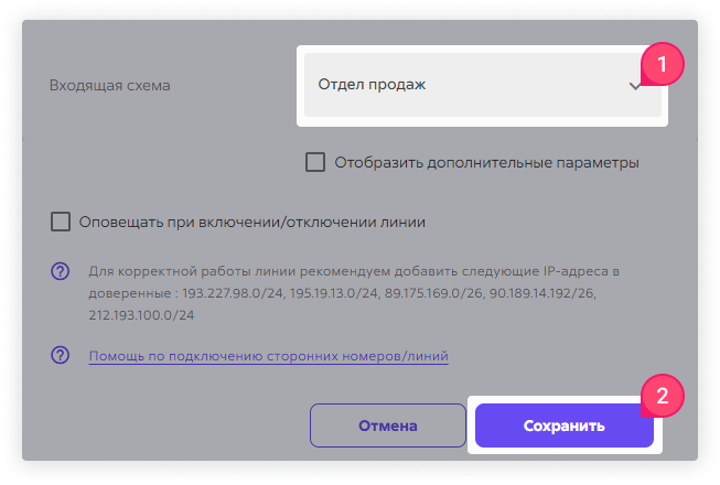 - В этом же окне спуститесь вниз и укажите входящую схему, на которую будут поступать звонки. Нажмите кнопку «Сохранить».
