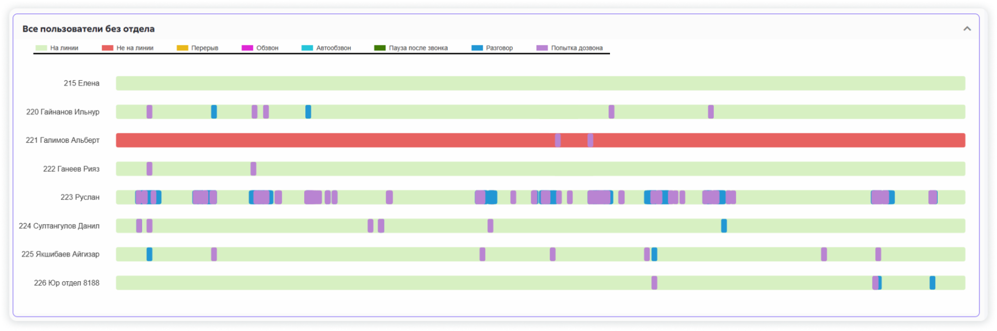 Статусы пользователей - графическое отображение загруженности сотрудника в течение указанного диапазона времени. График показывает сколько сотрудник пробыл на перерыве или в разговоре.