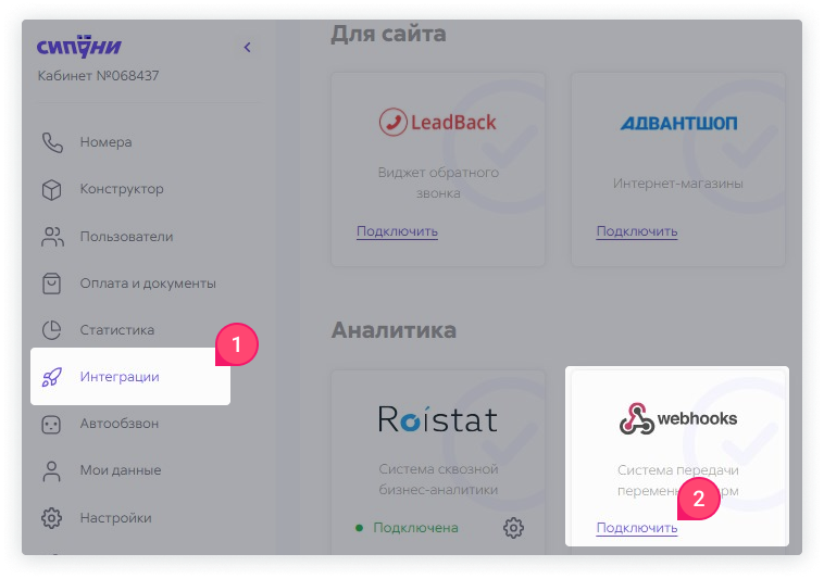 - В личном кабинете откройте раздел «Интеграции» → «Webhooks» → «Подключить».