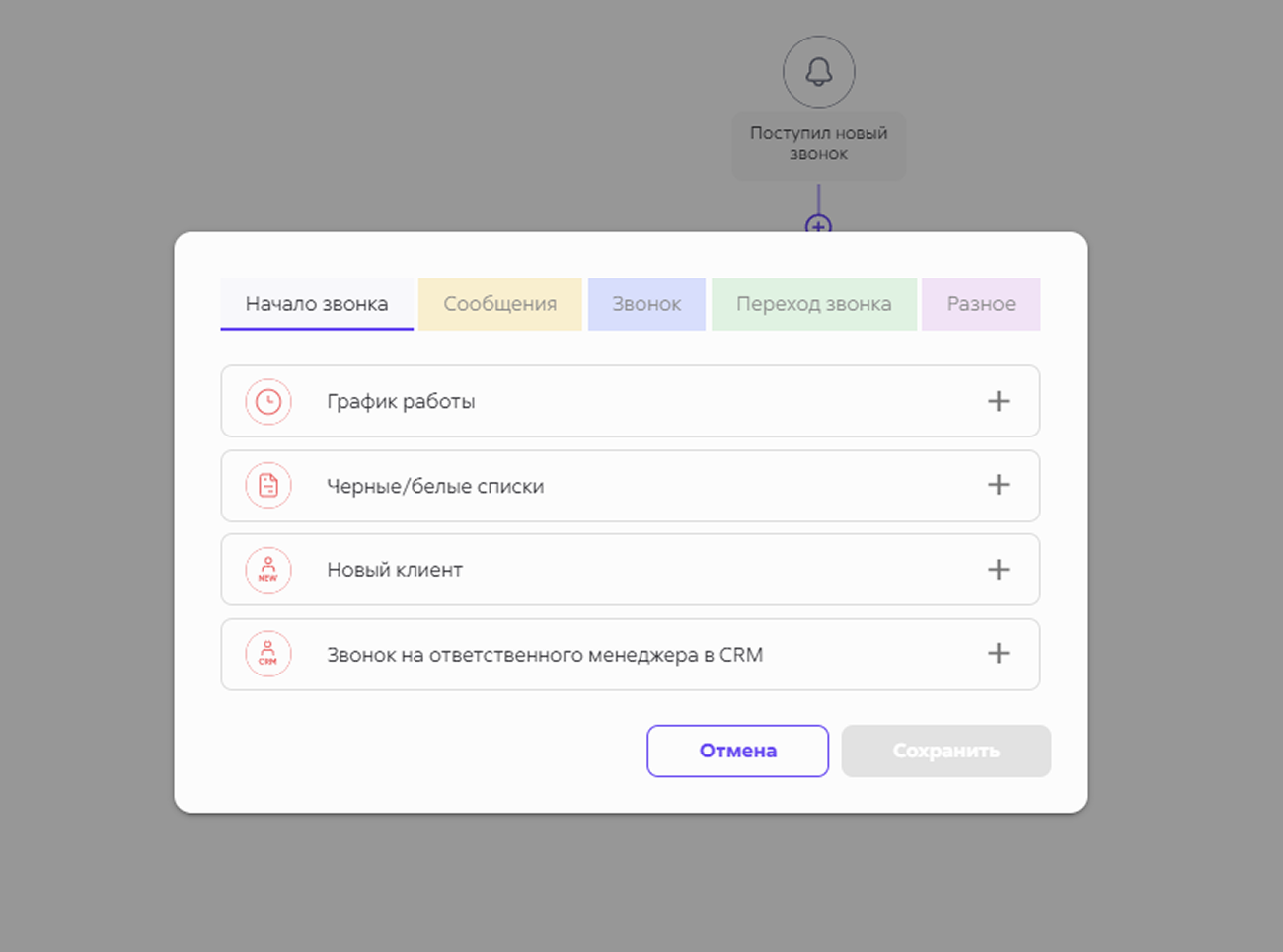 Конструктор — это визуальный редактор, в котором вы по частям настраиваете сценарий обработки звонка. Здесь вы выбираете, по какой логике будут распределяться звонки и куда в итоге попадет вызов.