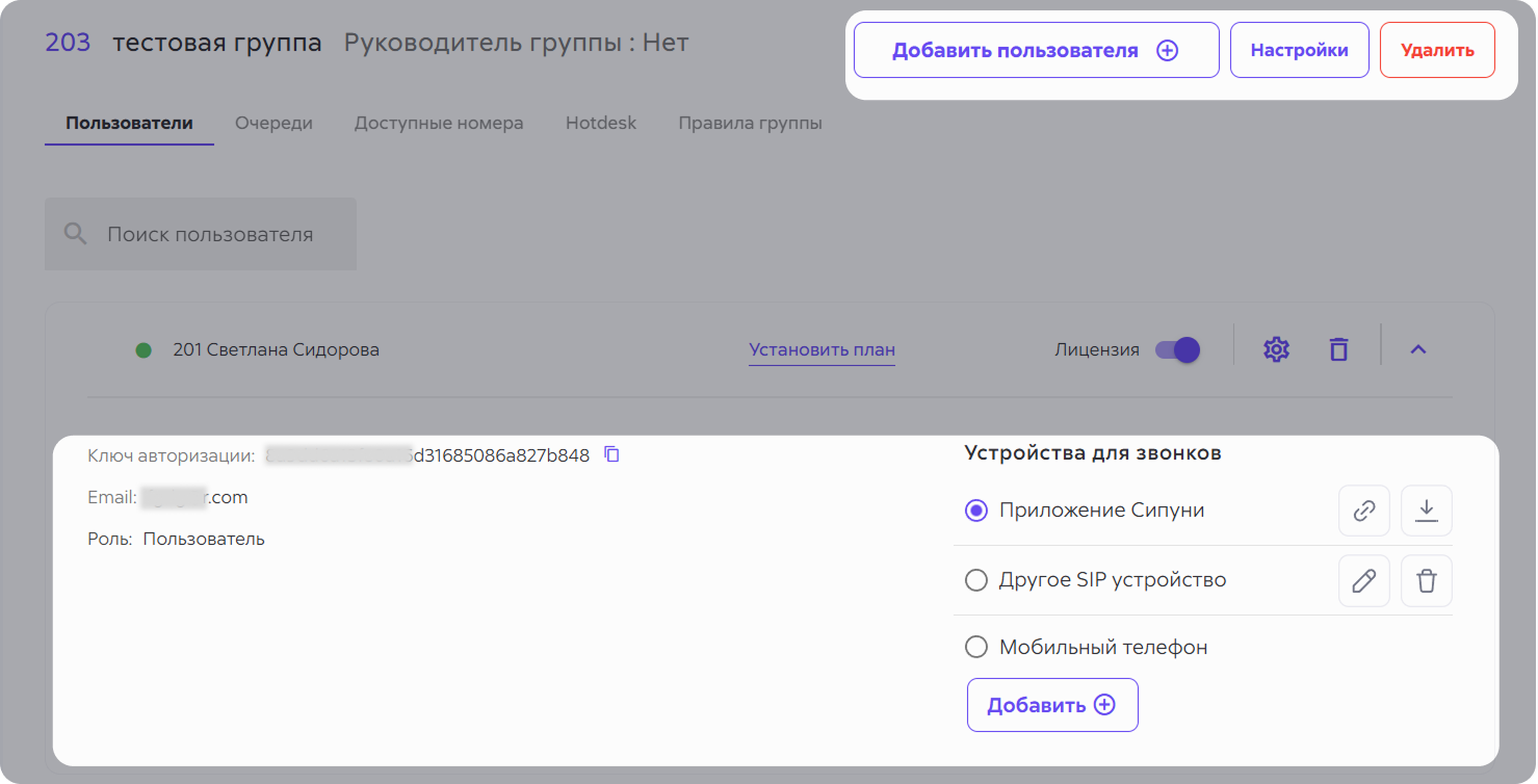 В разделе «Пользователи» вы управляете командами, которые работают со звонками. Здесь можно настроить сотрудников и их устройства, распределение звонков, правила работы группы и доступные статусы.