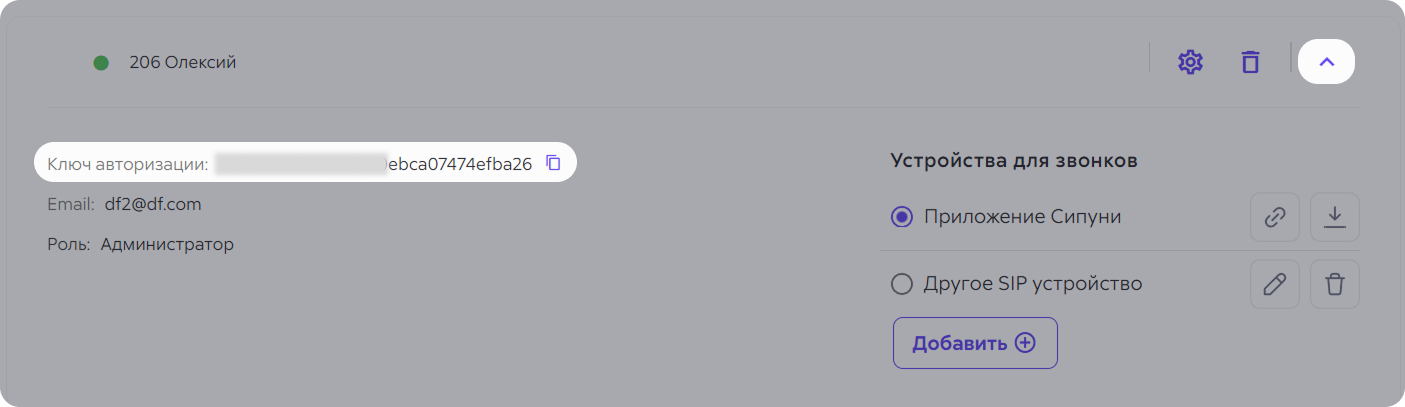 - Нажмите на стрелочку вниз, скопируйте ключ авторизации и передайте сотруднику.