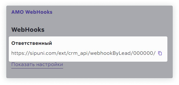AMO Webhooks — это специальные ссылки (URL). По этим ссылкам в Сипуни уходит запрос, и система запускает звонок.