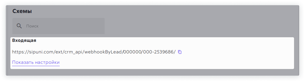 - В личном кабинете Сипуни откройте «Интеграции» → «amoCRM» → «AMO WebHooks» и скопируйте нужный URL — для звонка ответственному сотруднику или для звонка по схеме.