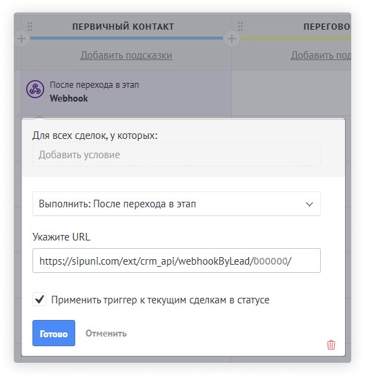 После подключения Сипуни к amoCRM звонки можно инициировать не только вручную, но и автоматически. Для этого используются вебхуки — специальные ссылки, которые запускают звонок прямо из CRM при наступлении события (например, когда сделка перешла на новый этап воронки).