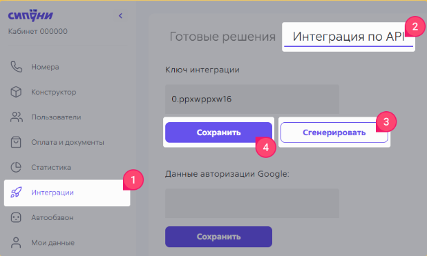 - Сперва вам нужно сформировать API ключ. Откройте раздел «Интеграции» в личном кабинете Сипуни → «Интеграция по API» → нажмите «Сгенерировать», а после «Сохранить». Ключ интеграции просто генерирует специальные ссылки для сценариев, с ним ничего делать не нужно.