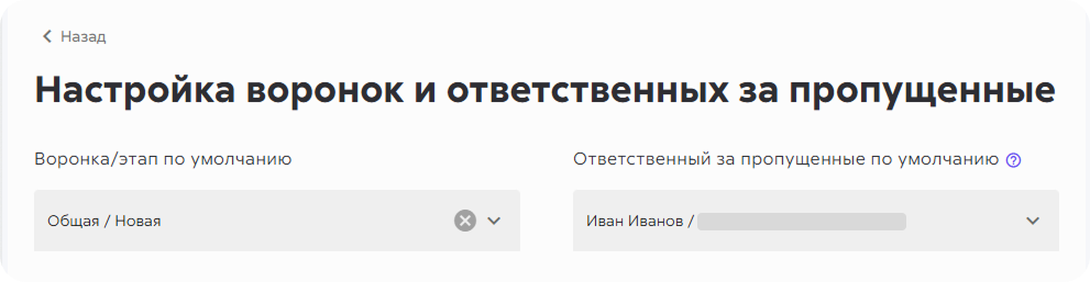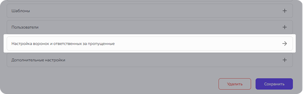 - Откройте блок «Настройка воронок и ответственных за пропущенные».