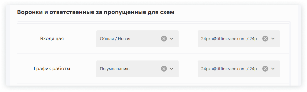 - Если у вас есть схемы с особыми правилами обработки звонков, можно назначить для них отдельных ответственных. Если этого не сделать, система назначит сотрудника по умолчанию.