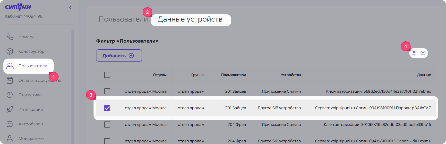 - Выберите сотрудников, которым хотите отправить данные → отметьте галочкой строки, где указано устройство «SIP‑телефон».