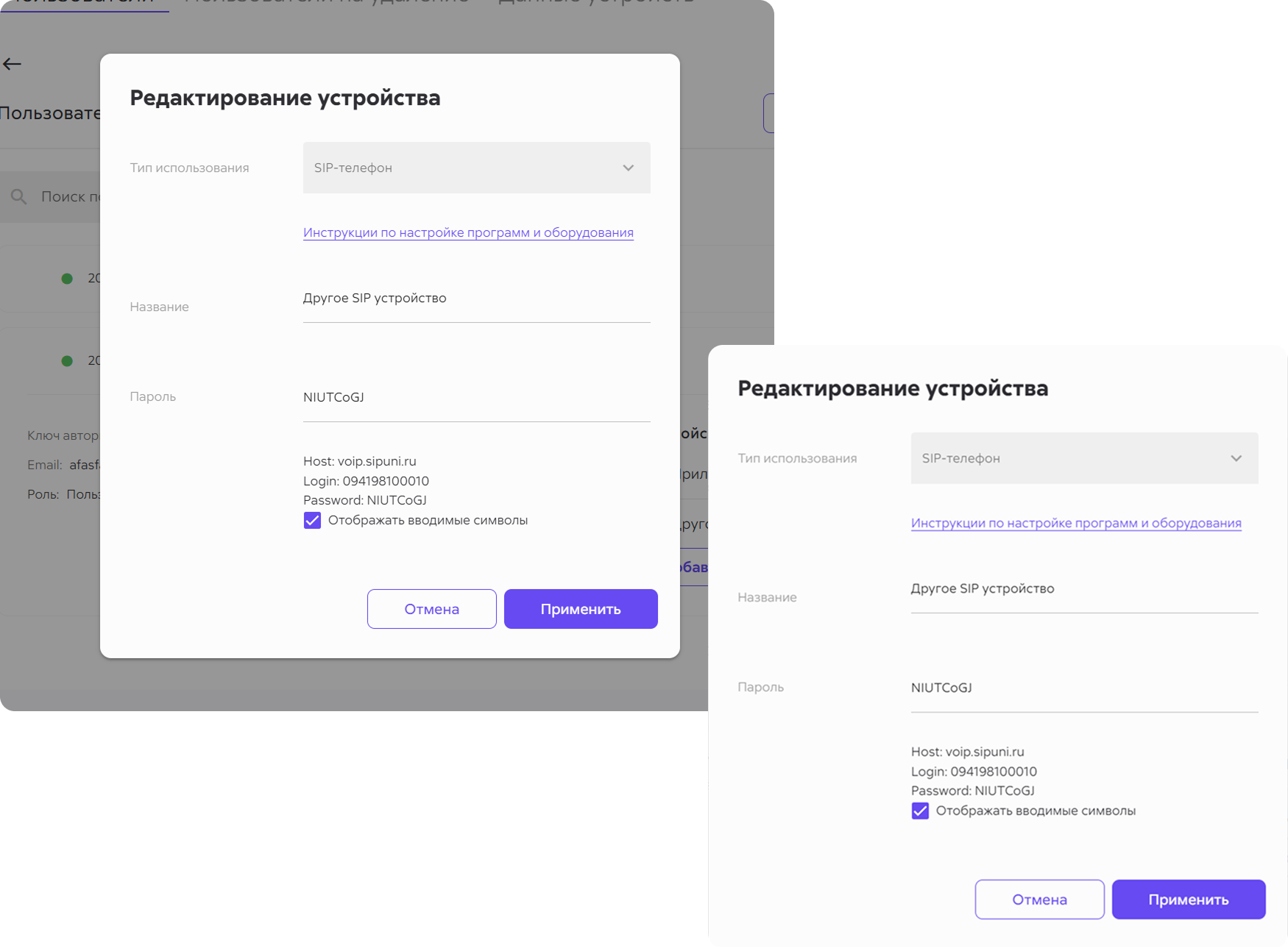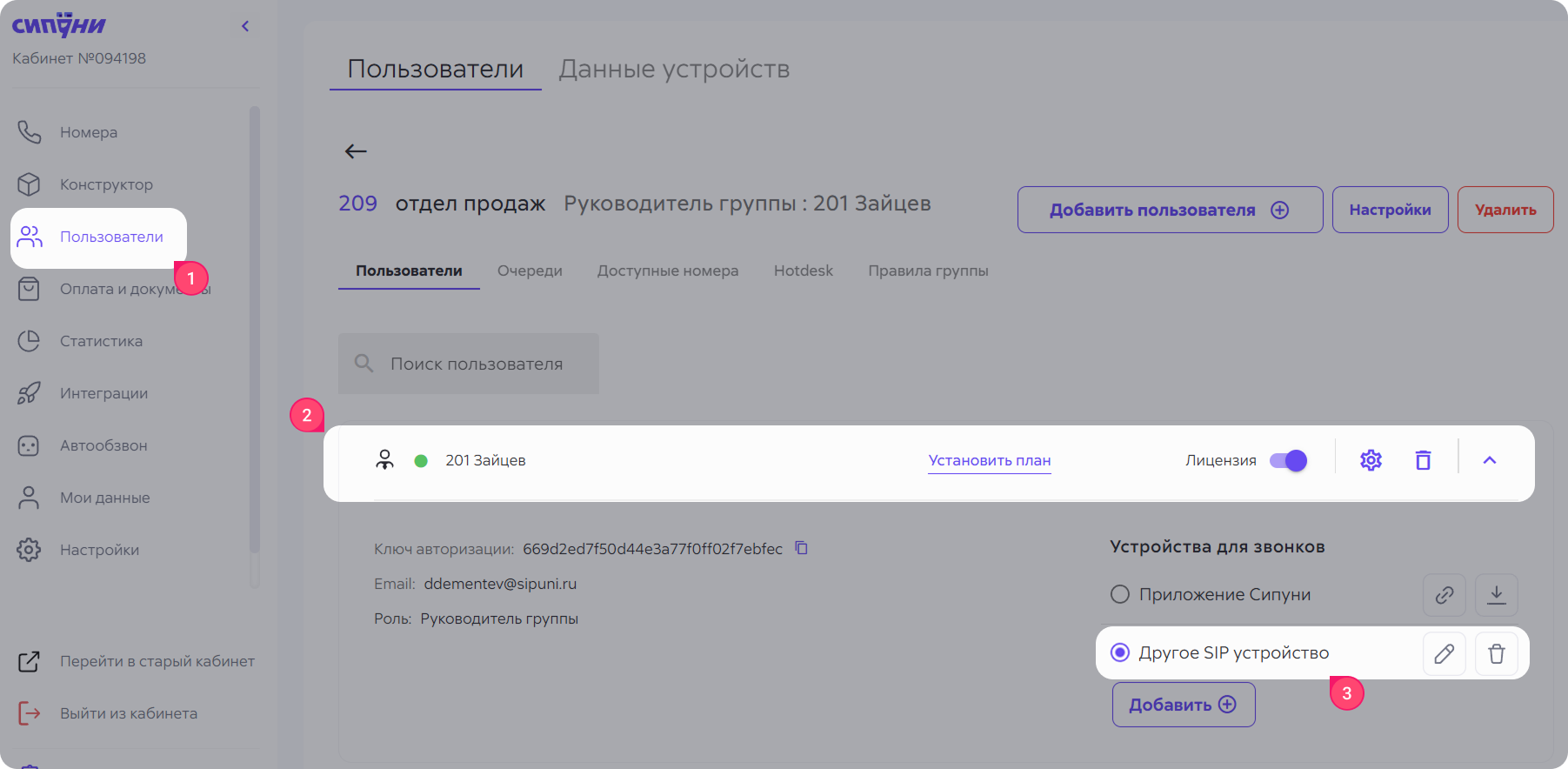 У каждого сотрудника по умолчанию есть два типа данных устройств: для «Приложение Сипуни» и для «Другое SIP устройство». Вам нужны данные для «Другое SIP устройство».