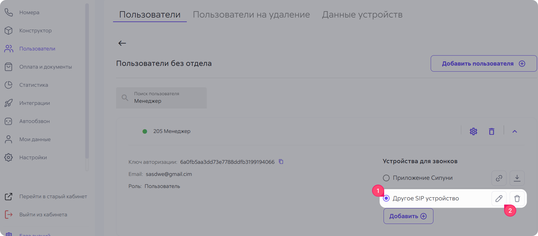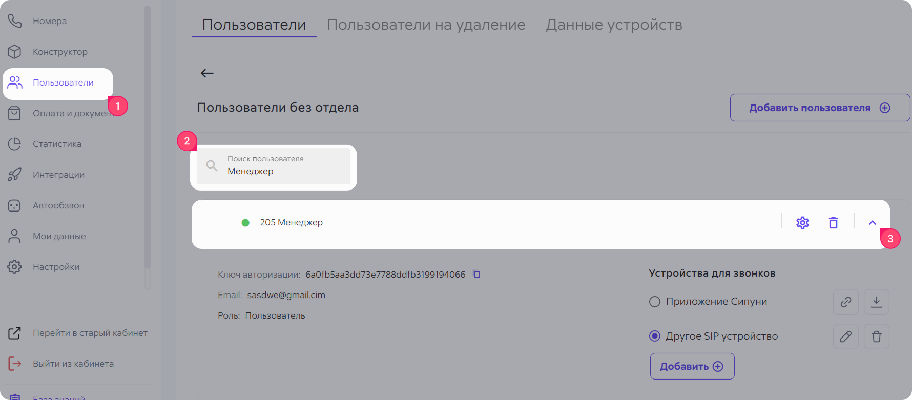 - В личном кабинете Сипуни перейдите в раздел Пользователи → найдите пользователя, который будет звонить через телеграм → разверните его вкладку.