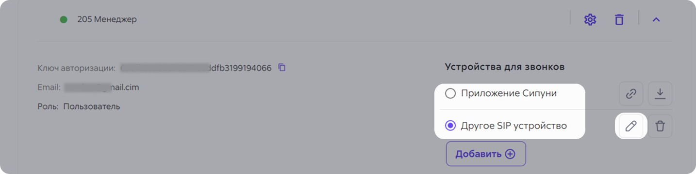 2. Данные авторизации находятся в меню «Пользователи». Откройте настройки учетной записи сотрудника на соседней вкладке браузера и скопируйте данные из устройств SIP-телефон.